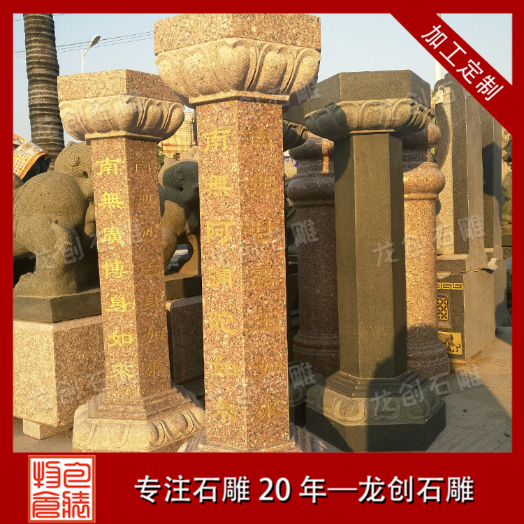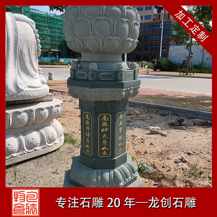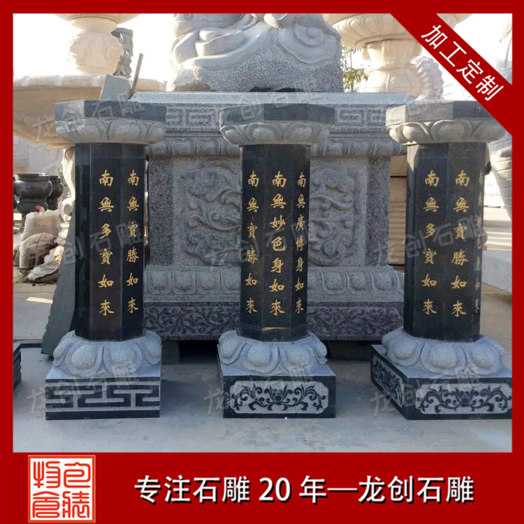 出食臺有各種不同形制、材質(zhì),造型上沒有固定的法制,多以幢型居多,常見的是石材,也有木刻。高度至少一百多公分以上,常見:圓形長柱、四面柱、八角型柱等不同形狀。石柱,可分為上、中、下三部分,上部多見以蓮花造型為臺,中段為石柱,柱上??逃谐鍪撑_,或與施食儀軌相關(guān)的佛號或字句,如七如來(南無多寶佛、南無寶勝佛、南無妙色身佛、南無廣博身佛、南無離怖畏佛、南無甘露王佛、南無阿彌陀佛)、四如來,或南無阿彌陀佛等佛名圣號,或刻「法力不思議」等字樣。有些大型石柱,甚至刻有七尊佛像,或其他吉祥圖案。下部常見以蓮花為底座。有些在臺柱中段處,雕刻樓臺欄循,或增加底部四方臺階。重要的乃是石柱上方或中段一處,可供平放些許食物之平坦處,有些亦設(shè)有一處可供插香燃香,亦可見香器、香座或香托等。