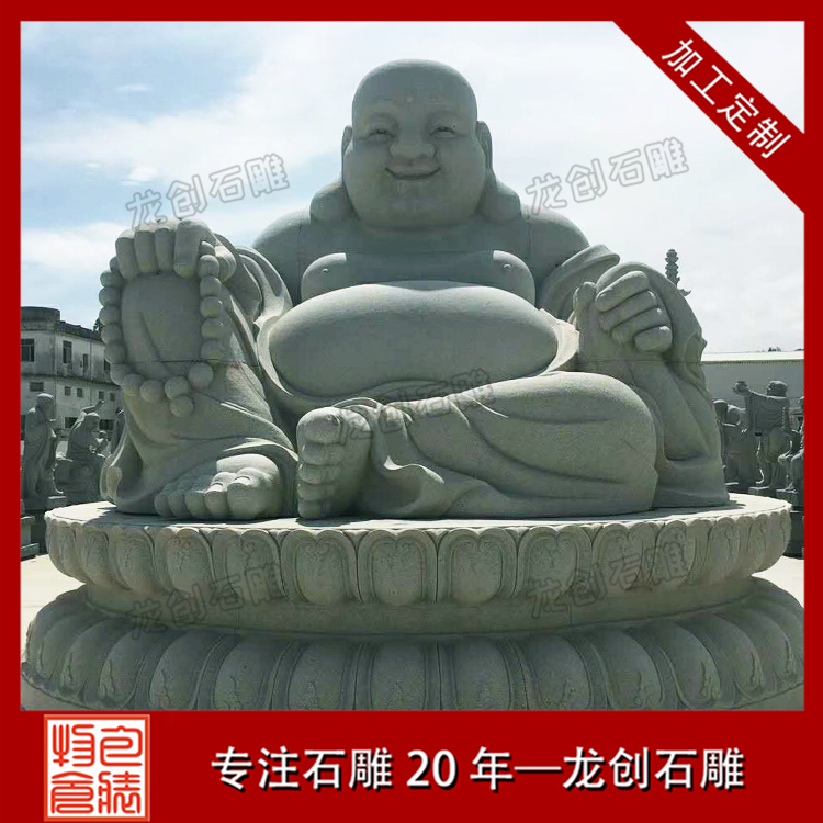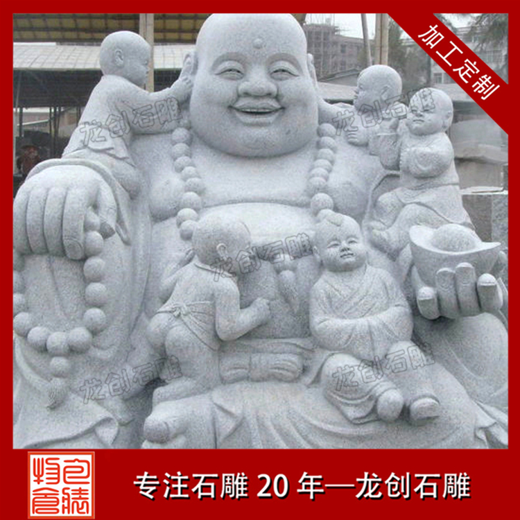 石雕彌勒佛手中還有一乾坤袋,可容天下萬物,無所不有。佛爺以慈善為本,普度眾生,常以袋中之物施舍眾生,救苦救難,尤其是金銀財(cái)寶。所以世人若求消災(zāi)解難,富貴平安,那一定要在家中供奉彌勒佛。當(dāng)然無論你是否得到你想要的東西,都應(yīng)該笑對人生,做一個(gè)像佛爺一樣的樂天派。所謂一笑解千愁。人們見此佛像,往往受他那坦蕩的笑容感染而忘卻自身的煩惱。很多寺院的彌勒殿還有這樣一幅對聯(lián):大肚能容,容天下難容之事;開口便笑,笑世間可笑之人。