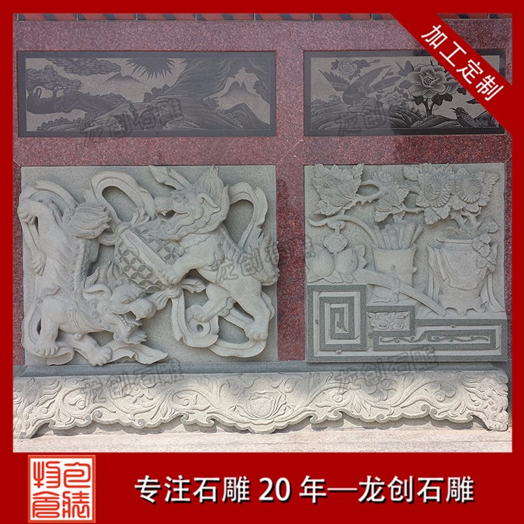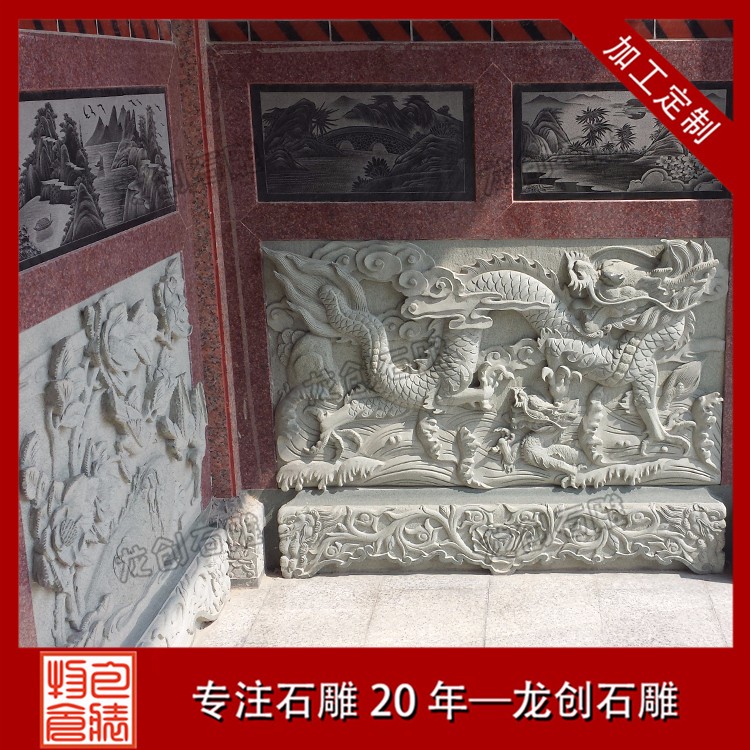 寺廟浮雕墻制作的厚薄度選擇一般有所屬物象的性質(zhì)、雕塑的主題內(nèi)容、放置位置及光線強(qiáng)弱等因素決定。浮雕壁畫作為我國傳統(tǒng)建筑中所特有的獨(dú)立構(gòu)建,被廣泛用于不同類型的建筑中,青石是各種石材中環(huán)保的石材,因其取材方便,自然存量巨大,耐磨,耐風(fēng)化,無輻射。