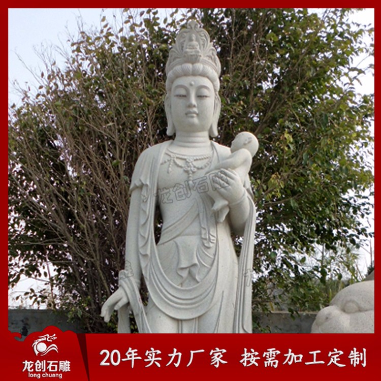 石雕送子觀音造型特點,送子觀音懷抱男童,臉帶慈和微笑,寓意著早生貴子,添丁添壽。家中如果兒子媳婦結(jié)婚已久,仍未能懷上男丁,不妨安置一座送子觀音,祝愿早日能夠添丁發(fā)財。