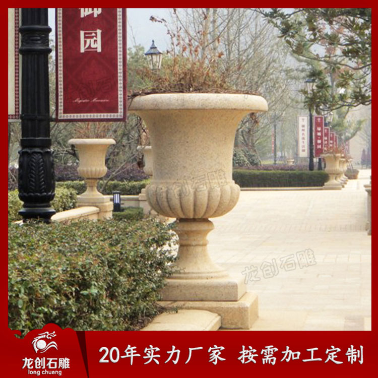 石雕花缽選材非常豐富,常見的花缽石材有花崗巖花缽,大理石花缽,砂巖花缽,埃及米黃石雕花缽,黃銹石花缽,黃金麻石雕花缽,漢白玉花缽,白麻花缽,芝麻灰花缽等等。花缽的款式也是多種多樣,歐式花缽,現(xiàn)代花缽,古典仿古花缽,圓形花缽,長方形棱角花缽等,花缽的表層可雕刻多種花樣,有雕刻蓮花瓣的,有動物雕塑或是人物雕塑的,常見的就是男童小孩造型的雕塑花缽。
