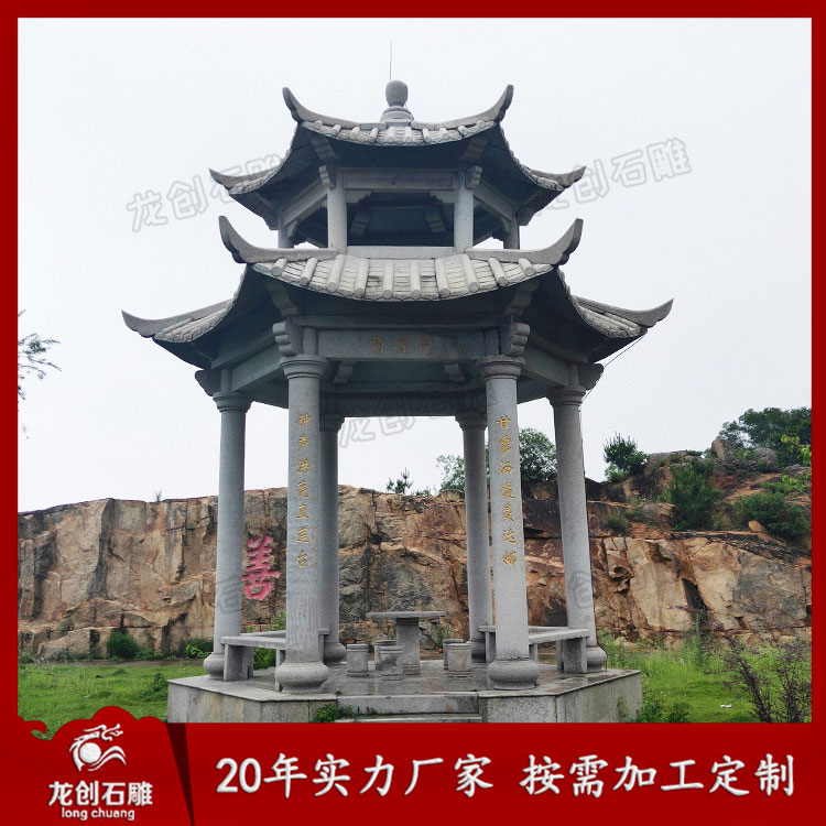 不管是四角石亭子還是六角石亭子,一般都為開(kāi)敞性結(jié)構(gòu),頂部可分為四角,六角、八角、圓形等多種形狀。其材質(zhì)多選用青石、花崗巖,晚霞紅等石材。泉州石亭子廠(chǎng)家,選惠安龍創(chuàng)石雕,專(zhuān)注石雕20年,支持按需定制。