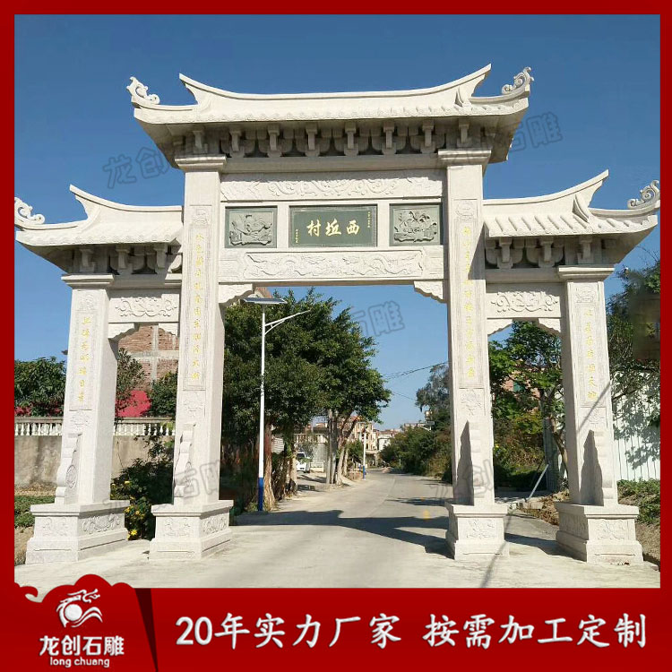 村口牌坊牌樓石雕的興起是一種盛世的象征。村口石牌樓體現(xiàn)了農(nóng)村經(jīng)濟(jì)繁榮、設(shè)施完善、環(huán)境優(yōu)美、文明和諧的社會主義新農(nóng)村的核心價值,這也是社會主義新農(nóng)村建設(shè)的成功見證之一。