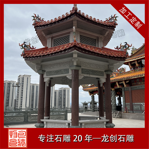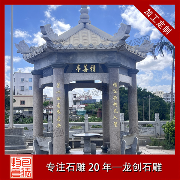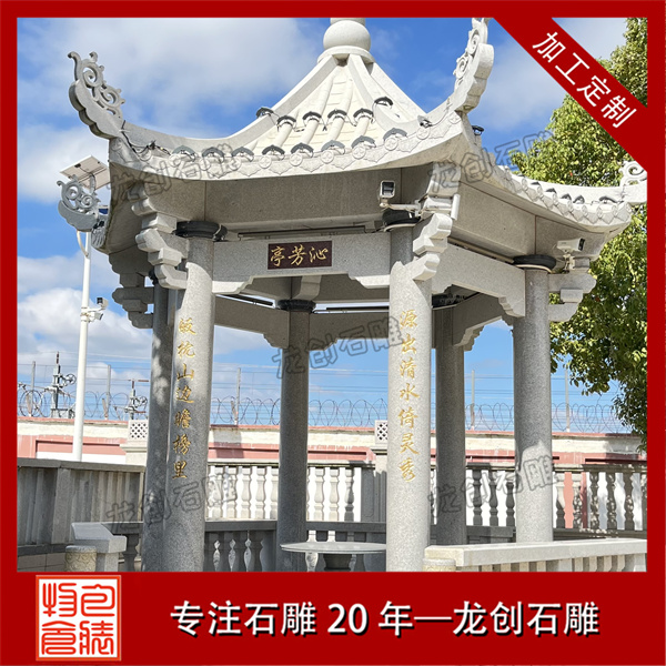 從工藝構(gòu)造來看,標(biāo)準(zhǔn)六角涼亭包含臺基、柱礎(chǔ)、檐柱、梁枋、屋面、寶頂六大組成部分。臺基常采用須彌座樣式增強(qiáng)穩(wěn)定感;六根檐柱通過精確的榫卯結(jié)構(gòu)與梁枋連接;屋面由六塊梯形石板精準(zhǔn)拼接形成流暢的排水斜面;頂部寶頂作為收束構(gòu)件兼具裝飾功能。雕刻工藝以淺浮雕為主,常在柱礎(chǔ)處飾以蓮紋,欄板處刻有簡化的幾何紋樣或自然圖案,保持整體風(fēng)格的協(xié)調(diào)統(tǒng)一。