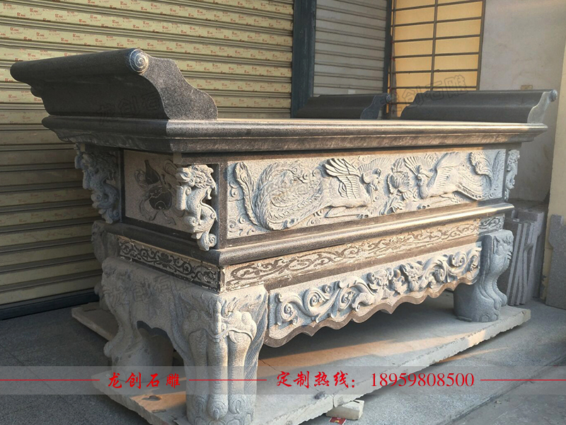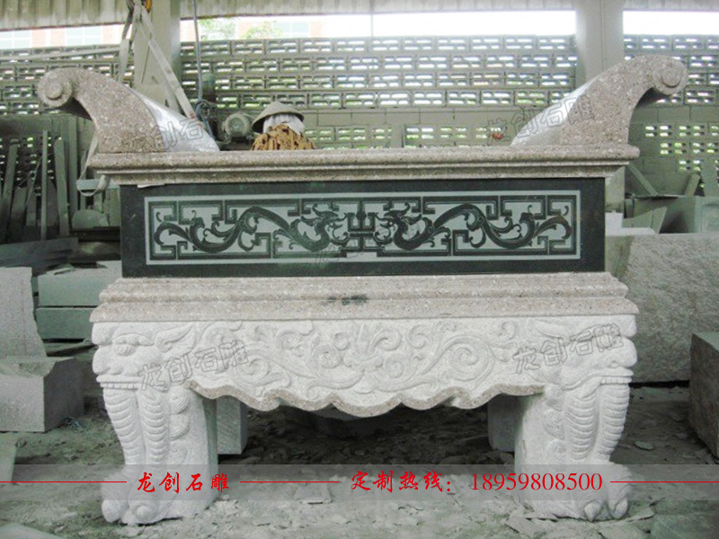 石雕供桌就是陳設(shè)供品的桌子,利用石材雕刻而成。石雕供桌常見款式為長方形,石頭材質(zhì)屬于青石,面中間是一精致的供桌,雕刻一龍王看廟,高度約與方桌相等。祭祀時常供設(shè)香爐、蠟竿和擺放供品,此為石頭所制,故名石供桌。供桌常見幾種地方擺放,廳堂供桌、佛堂供桌、寺廟供桌、神臺供桌等,與其配套的有香爐、石鼎。