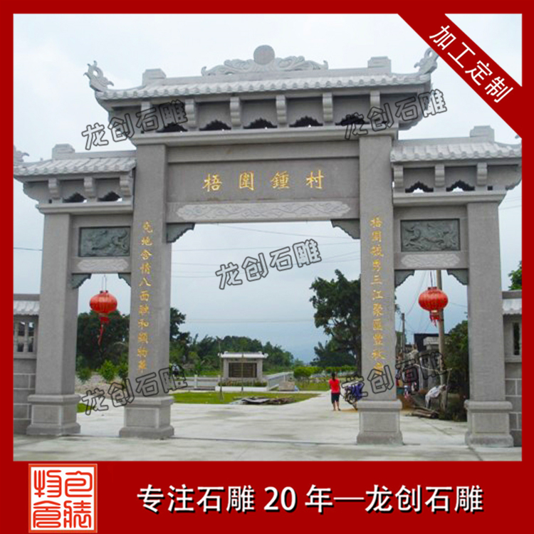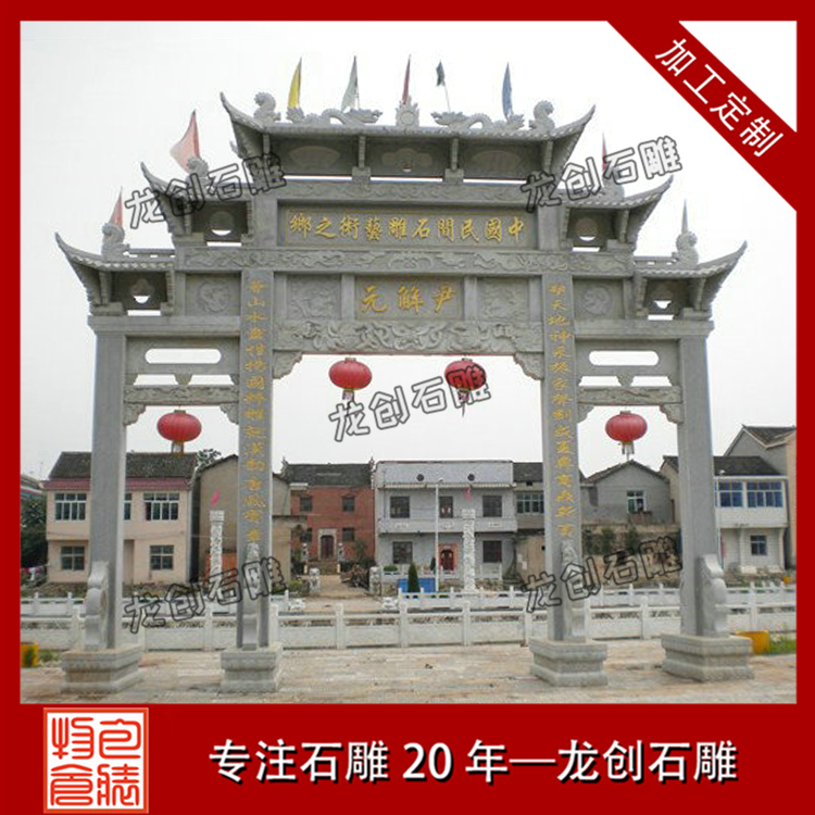 鄉(xiāng)村入口村牌坊的建造不僅是村莊的的一個(gè)標(biāo)志,它還代表著人們美好愿望的一種寄托。首先是石牌樓的建造作為一種標(biāo)志性的建筑,它用以標(biāo)明地名,在村子的入口處就能傳遞一種信息。同時(shí)石牌樓的安裝也代表著人們生活水平的,因?yàn)橐蛔茦堑膬r(jià)格相對(duì)來說還是比較昂貴的,即使單門的石牌樓價(jià)格也要幾萬元。