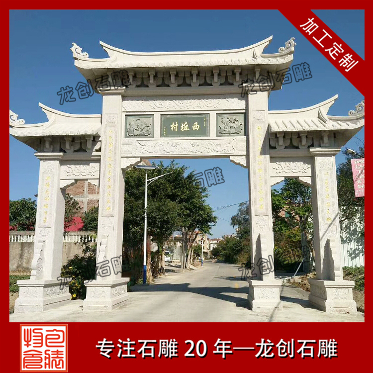 村口石牌坊定制加工浮雕有祥龍、麒麟、吉祥大象等,石獅子位置是石牌坊抱鼓石的位置,在石牌坊主體建筑門前人們不抬頭也可以一眼就看到,不僅很好地映襯和裝飾了進(jìn)村牌坊主體建筑,而且更地塑造了整個(gè)村莊的吉祥文化氣氛。古人生活在一個(gè)易受自然災(zāi)害侵襲和其他不確定因素侵犯的環(huán)境中,需要這種“進(jìn)村石牌坊布局加以保護(hù),進(jìn)村牌坊雕刻具有寧靜、安詳?shù)奶攸c(diǎn)。進(jìn)村牌坊上的守門石獅的設(shè)置正是對這一特征的強(qiáng)化,是古人追求平靜祥和這一心理特征的側(cè)面反映。