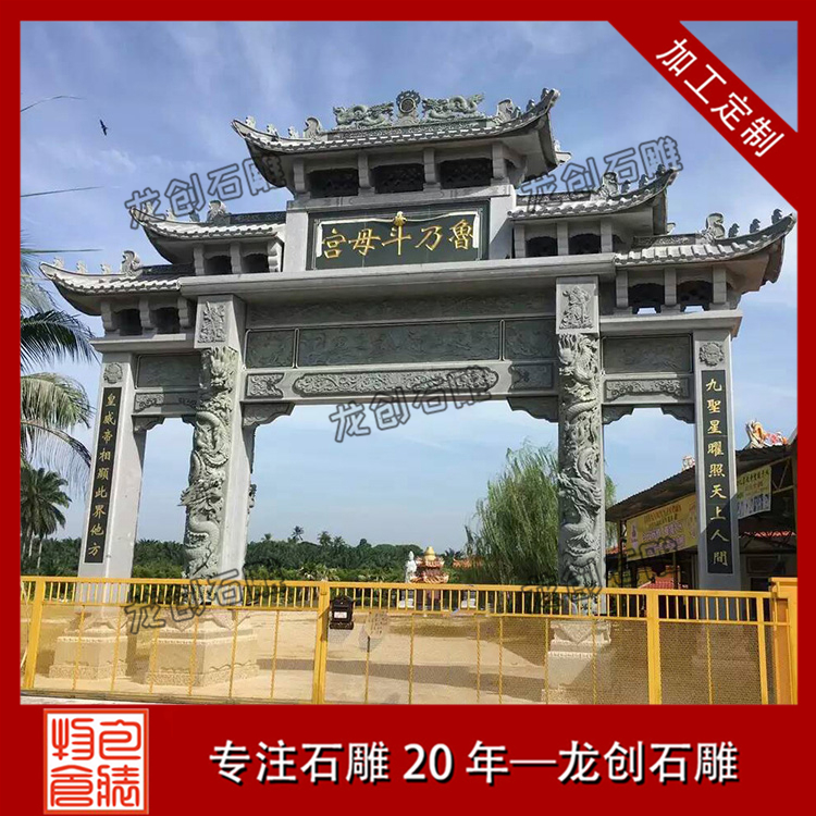 牌坊上經(jīng)??吹礁〉颀?jiān)谥袊膫鹘y(tǒng)文化中是吉祥的象征,龍?jiān)谠浦邪肯?,將?yōu)美的姿態(tài)展現(xiàn)給世人看,線條流暢;寓意龍龍四海,還有石獅子抱鼓石有鎮(zhèn)宅等作用,花鳥、圖案、龍鳳及各種瑞獸等都有祥瑞之意,修建這樣的石雕牌坊大門,更能令村莊吉祥如意。龍創(chuàng)石雕專注牌坊制作20年,堅(jiān)守工匠本心,將每一座牌坊制作都追求優(yōu)質(zhì)。